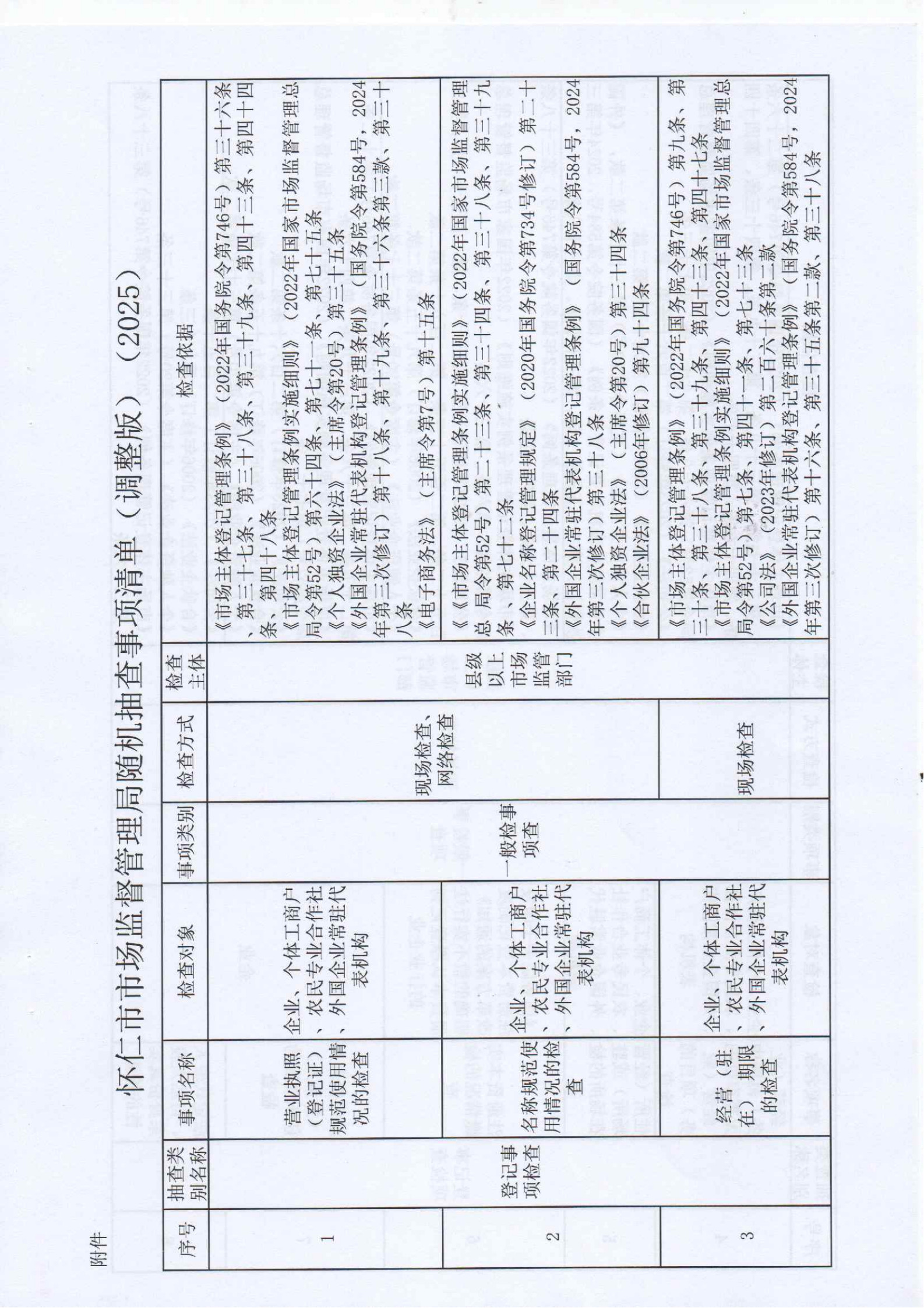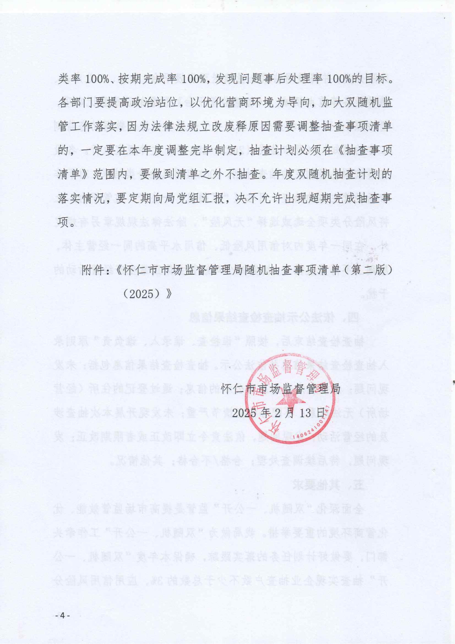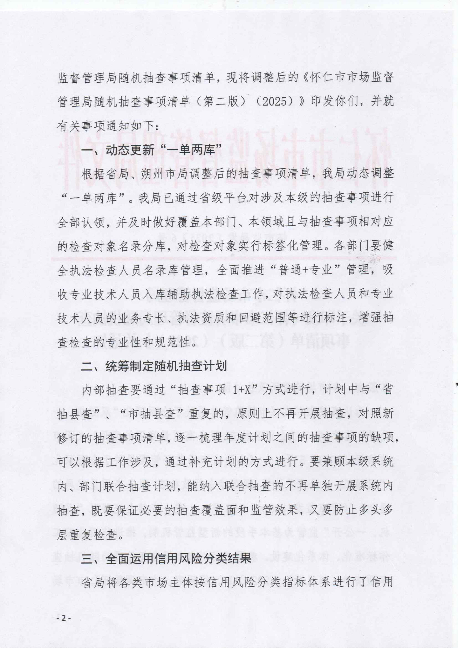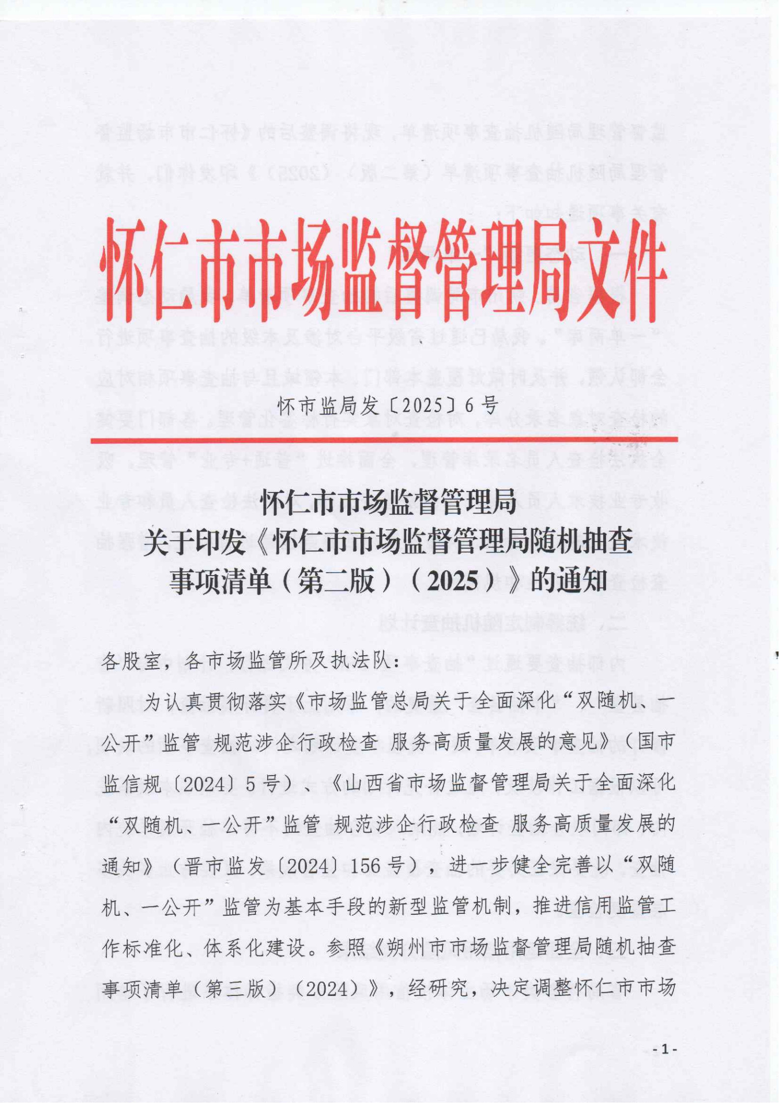 怀仁市市场监督管理局关于印发《怀仁市市场监督管理局随机抽查事项清单(第二版)(2025)》的通知