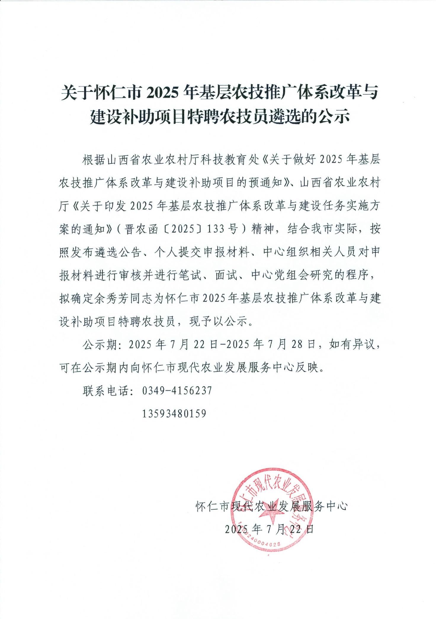 关于怀仁市2025年基层农技推广体系改革与建设补助项目特聘农技员遴选的公示